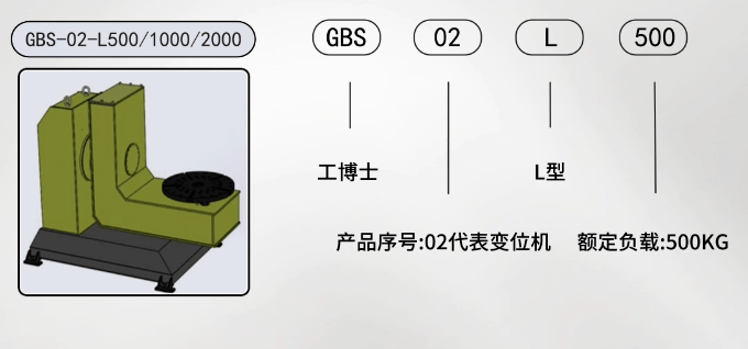 GBS代表工博士品牌;02部分為產(chǎn)品序號,02代表變位機;L代表L型,500/1000/2000代表其額定負載的大小;尾綴無F代表焊接版,標識F代表鑄造版。