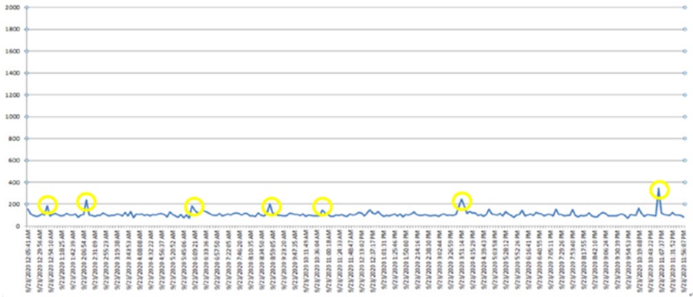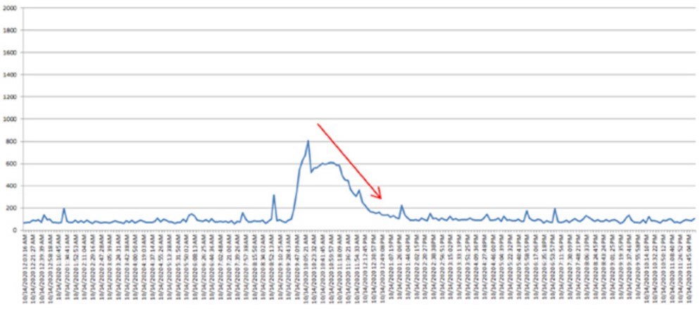 在回收水質(zhì)異常時(shí),儀器會(huì)實(shí)時(shí)呈現(xiàn)上升趨勢,這時(shí)候客戶會(huì)對該水樣進(jìn)行處理,處理時(shí)水樣會(huì)劇烈波動(dòng),處理完畢后會(huì)回歸正常測值。如下圖紅色箭頭所示。