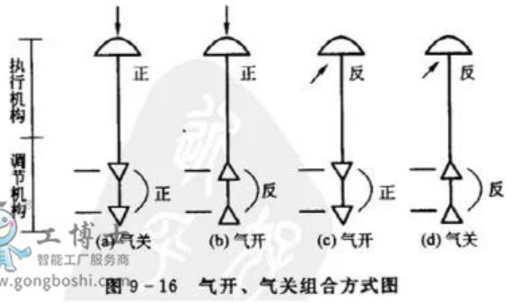 (3)氣動執(zhí)行器的作用形式。氣動執(zhí)行器有氣開式和氣關(guān)式兩種形式。信號壓力增加時閥開,稱為氣開式;反之,信號壓力增大時閥關(guān),稱為氣關(guān)式。由于執(zhí)行機構(gòu)有正、反作用,調(diào)節(jié)閥(具有雙導(dǎo)向閥芯)也有正、反作用,因此氣動執(zhí)行器的氣開或氣關(guān)即由此組合而成。