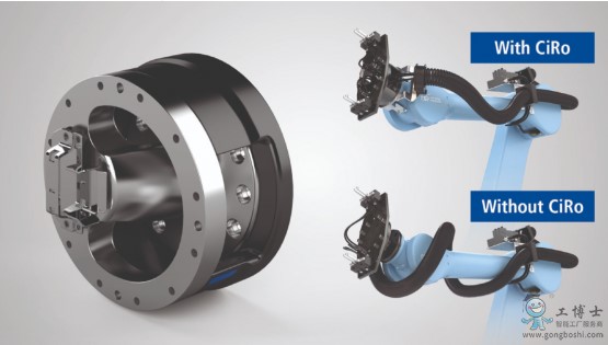 就像以前的型號一樣,CiRo XL允許在機器人軸6上旋轉高達500°。得益于高精準的設計,這可以在不讓電纜和軟管限制這種旋轉的情況下實現(xiàn)。獲得相對簡單的解決方案,抵消任何不可預測的生產停止,并極大限度地減少維護需求。CiRo還可以與機器人系統(tǒng)產品管線包結合使用,以進一步簡化機器人的修整。