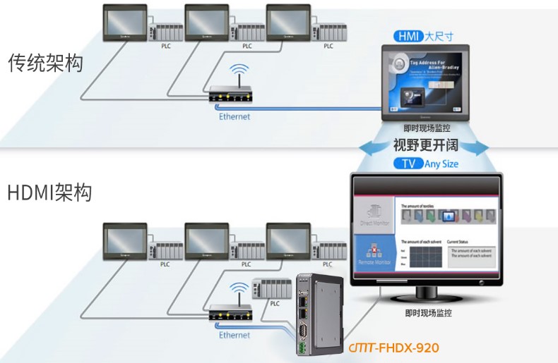 他們在方案上選擇cMT-FHDX-520+EasyAccess 2.0遠程監(jiān)控,實現(xiàn)遠程+大屏顯示的解決方案: