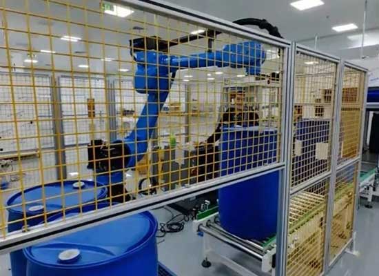 工博士化學(xué)品溶劑搬運(yùn)方案通過(guò)機(jī)器人+夾爪的形式將化學(xué)品溶劑穩(wěn)定的抓取和放置在傳送帶上。同時(shí)配置了管線(xiàn)包、防護(hù)服和安全圍欄確保機(jī)器人本體與周邊在搬運(yùn)過(guò)程中不會(huì)對(duì)工人造成傷害,提高了搬運(yùn)過(guò)程的安全性。